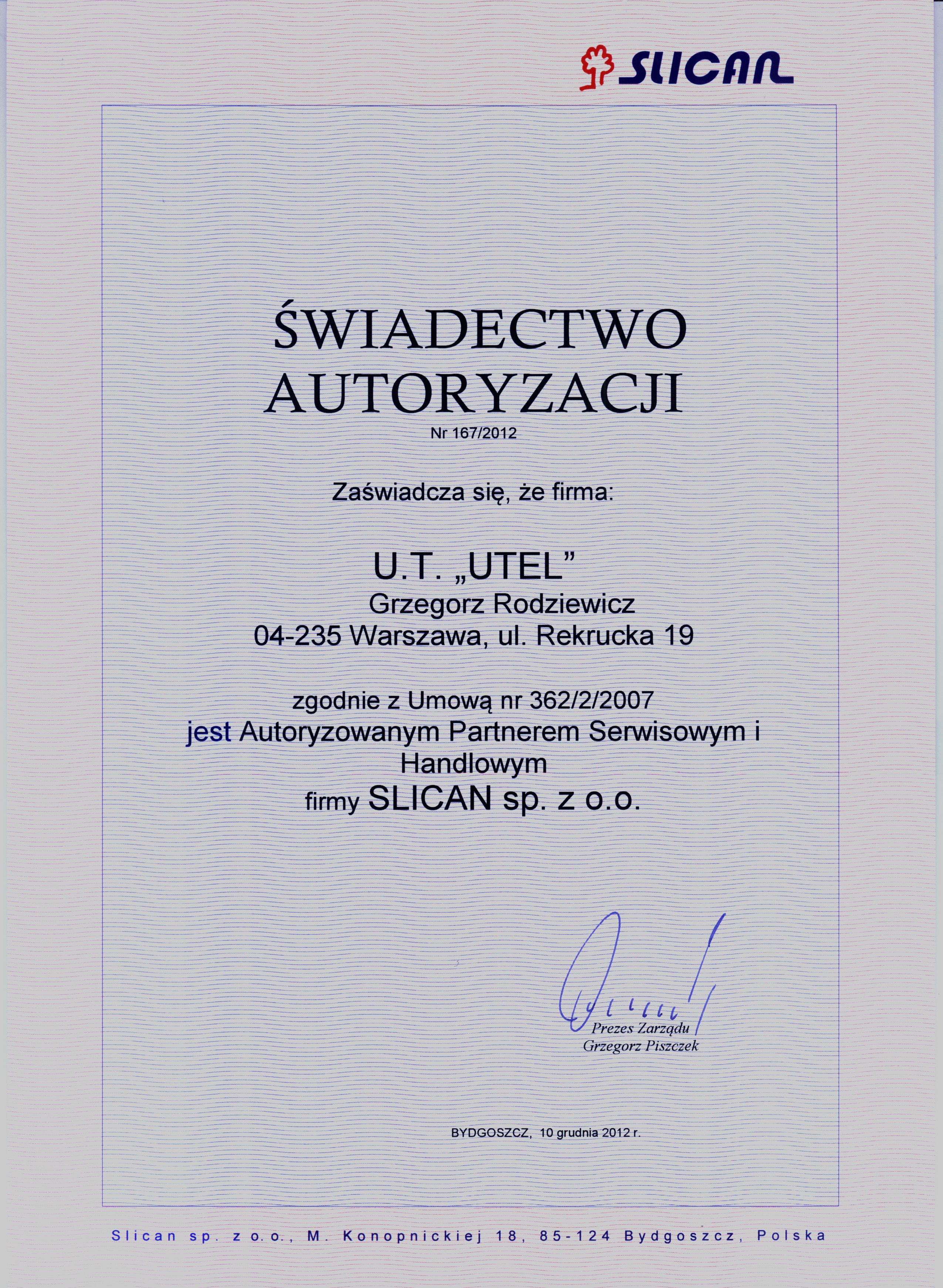Przedstawiciel i autoryzowany serwis firmy SLICAN